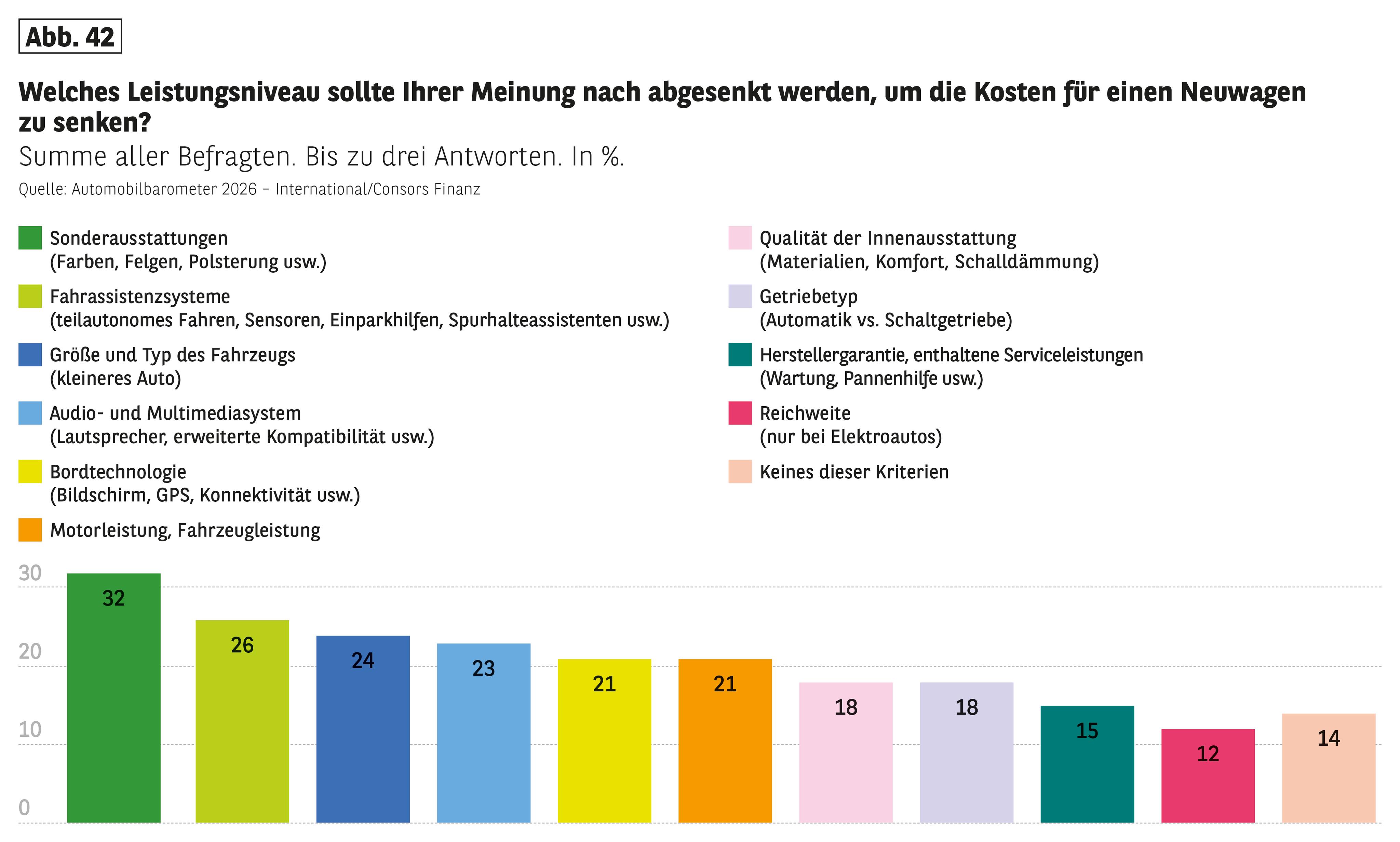 - "Welches Leistungsniveau sollte Ihrer Meinung nach abgesenkt werden, um die Kosten für einen Neuwagen zu senken?"